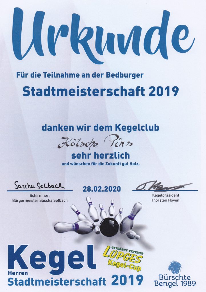 Urkunde Stadtmeisterschaft 2019 Posted on 28 Februar, 2020 by Woody Wir bedanken uns für die tolle Organisation bei der Bedburger Stadtmeisterschaft 2019. Auch konnten wir neue Kontakte knüpfen und der Spaß kam nicht zu kurz. Bis zum nächsten Mal 🙂